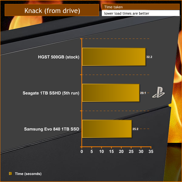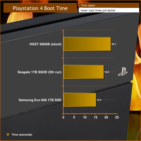 The stock HGST drive installed in the Playstation 4 is very slow, not a shock considering it is an inexpensive 5,400 rpm 2.5 inch model. When we swap over to the Seagate 1TB SSHD model the times are eventually reduced to 18.8 seconds, a noticeable improvement. The Samsung EVO 840 1TB Solid State Drive is by far the fastest, dropping the time by 7 seconds overall.