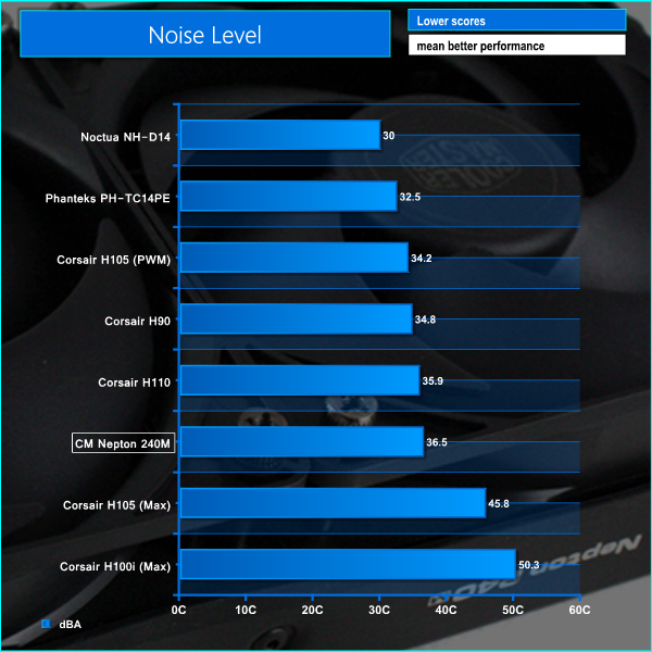 This result is impressive considering the fans are running at 2400 RPM. It is worth noting that the noise level drops to under 30 dBA when running the fans in PWM mode.