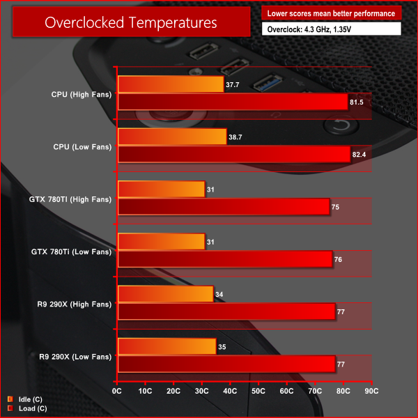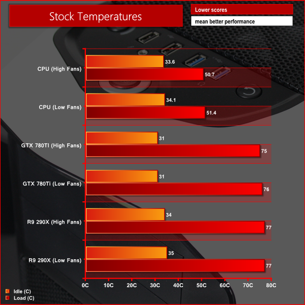 To test the thermal performance of the Corsair Graphite 780T we loaded our test system for 15 minutes using Prime95 and Furmark and recorded the maximum temperatures reached using CPUID Hardware Monitor. We then restarted the system and left it for 15 minutes before recording idle temperatures.