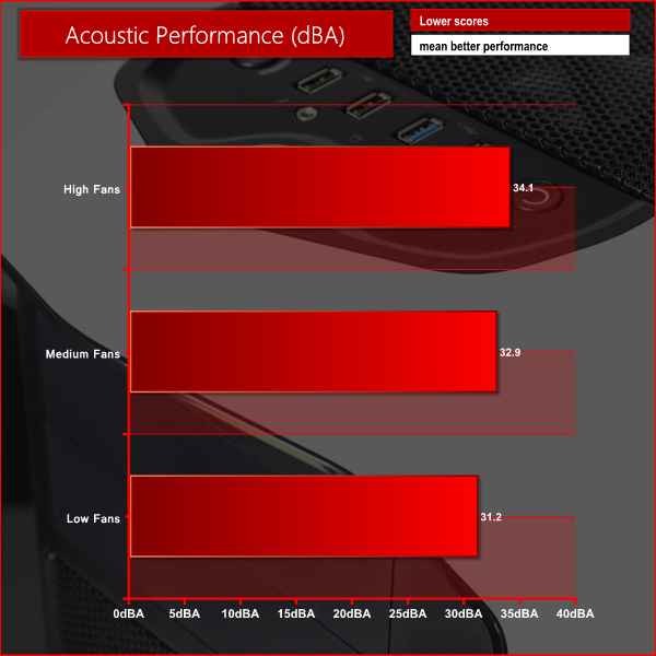 We can see that even with the fans at full speed the case remains pretty quiet. Those looking to build a very quiet system should invest in some ultra quiet fans, though, as the included ones aren't exactly silent.