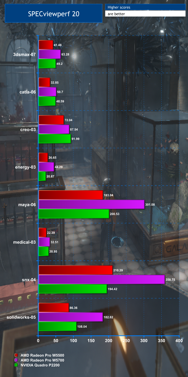 Overall, apart from engineering CAD and product design with Siemens NX or seismic visualisations, the AMD Radeon Pro W5500 is behind the NVIDIA Quadro P2200, which is very disappointing. Where we found the AMD Radeon Pro W5700 could compete favourably with the NVIDIA Quadro RTX 4000, its cheaper sibling isn't so impressive for most content creation applications.