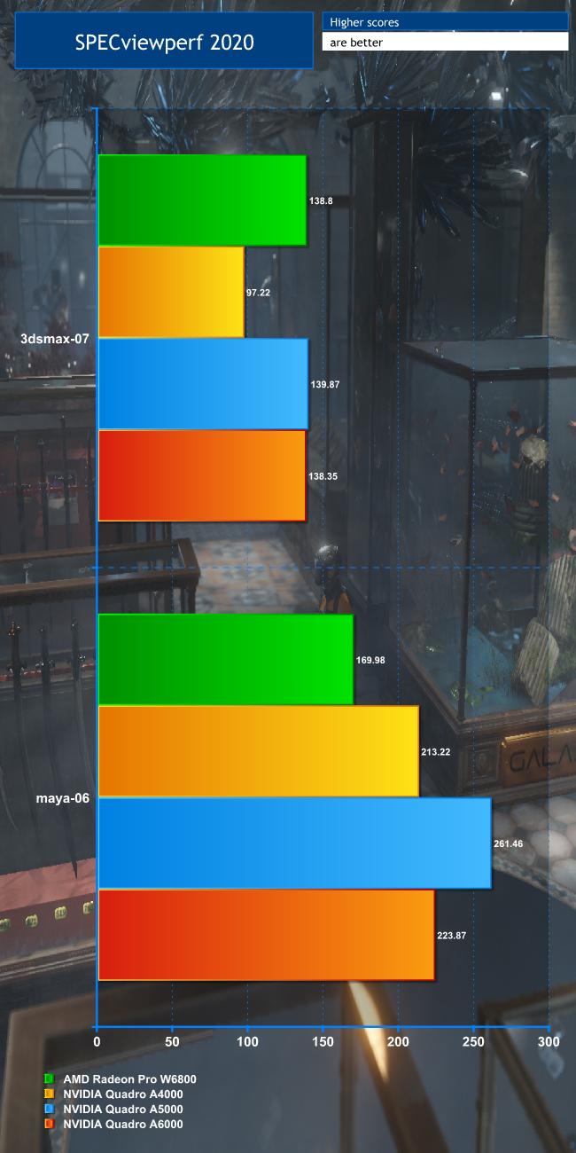 Overall, then, while the W6800 is clearly capable at multi-tasking, so are the NVIDIA Ampere cards. And, since they are faster to begin with, the final frame rate is higher.