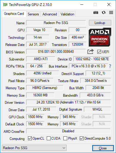 The Radeon Pro SSG and WX 9100 both use High Bandwidth Memory. They both have 16GB of this HBM2 frame buffer running on a 2,048-bit bus at 945MHz, providing a whopping 483.8GB/sec of bandwidth. The GPU in both cards is home to an equally huge 4,096 Stream Processors running at 1,500MHz. This provides a potential 12.3TFLOPS of single-precision and 769GFLOPS of double-precision performance.