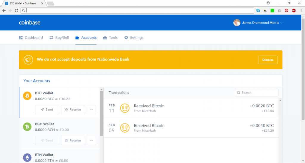 The reason why we chose Euros was because Coinbase doesn’t support deposits or withdrawals in Pounds Sterling. You can still send money to some UK banks, but it will be sent in Euros and the bank will convert it for you, incurring still more charges. The method used is called SEPA (Single Euro Payments Area), and it operates via the International Bank Account Number (IBAN). Despite the name, SEPA includes non-Euro countries such as the UK, Sweden, Norway and Switzerland. It’s a well-established system, but fees can be high. For example, Santander charges £15 to send a SEPA payment, although not for receiving funds this way.