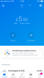 We spent some time looking for the optimal alternative to a regular UK bank with the least charges, and the solution we came up with for now is a virtual bank account called Revolut. This is aimed at mobile users and has the ability to hold funds in lots of different fiat currencies. It can instantly exchange between them with decent rates and no fees. It can provide you with a virtual debit card and can even issue you with a real physical debit card. There is experimental support for cryptocurrency, but this is only internal – you can’t pay into Revolut with cryptocurrency.