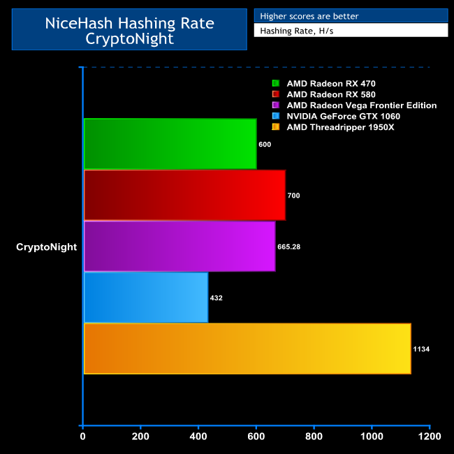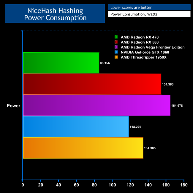 We have included the Vega Frontier Edition and Threadripper in this graph, because from a power consumption perspective they shape up well for mining, despite the initial cost. The Vega Frontier Edition consumes almost twice as much power as the RX 470, but it's also twice as fast with lots of algorithms. The Threadripper is also relatively cheap to run, considering its profitability.