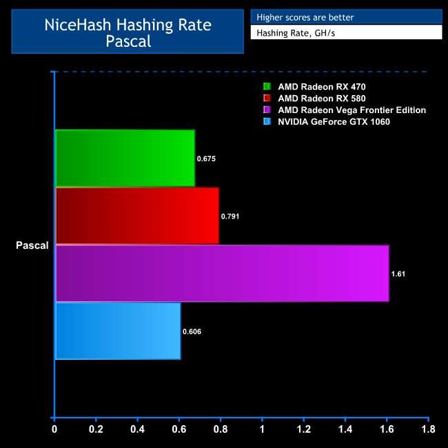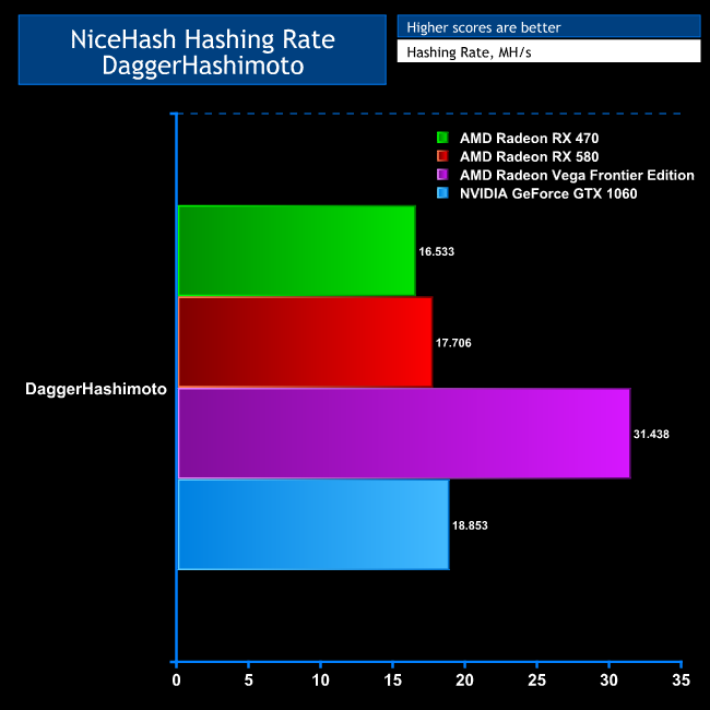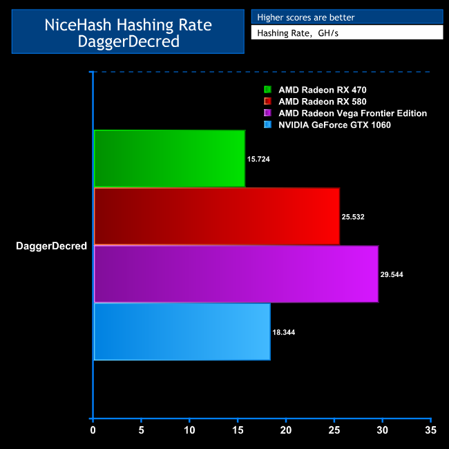 With DaggerDecred, the RX 580 is 62 per cent faster than the RX 470, and the GTX 1060 is 17 per cent faster than the RX 470. So the RX 580 provides the best performance for the money, and isn't that far behind the Vega Frontier Edition in overall performance. The RX 470 and GTX 1060 are equal second, since the latter is 17 per cent more expensive and 17 per cent faster, so you get what you pay for.