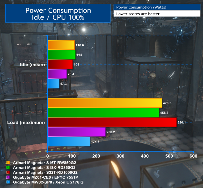 The story is even more impressive when you look at power consumption. When idle, our Gigabyte MW32-SP0 setup only consumed 47.3W, and under load it still only consumed 174.5W, making it very efficient, although not as efficient as the EPYC 7551P, which performed way more work per Watt than anything else.