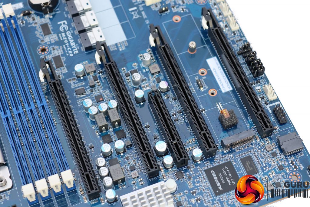 Although Threadripper seemed well endowed with 64 PCI Express lanes, EPYC goes even further, offering 128 PCI Express lanes. This gives a clear-advantage with GPU compute configurations on a motherboard like the MZ01-CE0, because it can offer four PCI Express x16 slots that all operate at the full x16, alongside a PCI Express x8 slot that can operate at x8, and PCI Express Gen3 x4 NVMe.