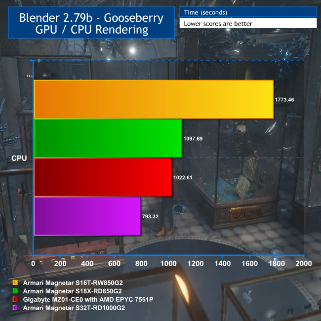However, in workstation and server multi-threaded workloads, brute performance isn't the only factor to consider. We also monitored power draw during this render. The AMD Threadripper 1950X-equipped Magnetar S16T-RW850G2 was consuming a peak of 470.3W, the Intel Core i9-7980XE-equipped S18-RD850G2 a peak of 458.3W, and the AMD Threadripper 2990WX-equipped S32T-RD1000G2 a peak of 530.1W.