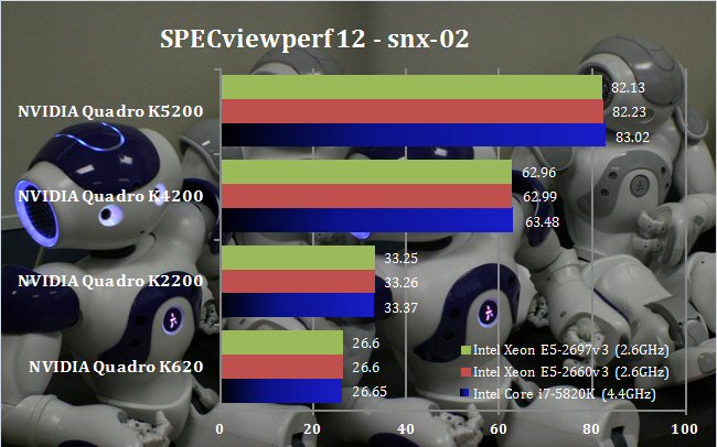 This is yet another viewset where the host CPU is all but irrelevant. However, performance is reasonably in line with the extra GPU power available as you go up the range. Again, the NVIDIA Quadro K4200 is the standout in terms of performance for the money, but the K2200 doesn't get you so much over the K620. It's becoming abundantly clear why the K4200 is such a popular mainstream workstation choice.