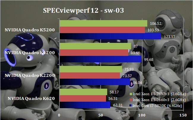 Of all of the SPECviewperf viewsets, the SolidWorks test is the most clearly affected by processor core clock speed. The Intel Xeon E5-2697v3's faster Turbo mode compared to the E5-2660v3's gives it a small boost, but the Core i7-5820K's overclock provides the most noticeable benefit, and increasingly so the more powerful the graphics. If you're doing product design with SolidWorks, an overclocked Core i7 is the obvious platform of choice at the modelling stage, although spending too much on graphics is less imperative, as even the Quadro K2200 manages a decent showing, whilst spending more than four times as much on the K5200 only provides a 43 per cent boost in performance.