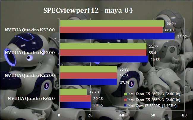 Maya appears to get at least some benefit from faster processor core clocks, and the extra modelling performance moving up the Quadro range is noticeable too. The K2200 is almost twice as fast as the K620, and the K4200 around 50 per cent faster still. However, the returns diminish when you move up to the K5200, particularly on the lower-clocked Xeons, making the K4200 the sweet spot for Maya users in terms of performance for the money.