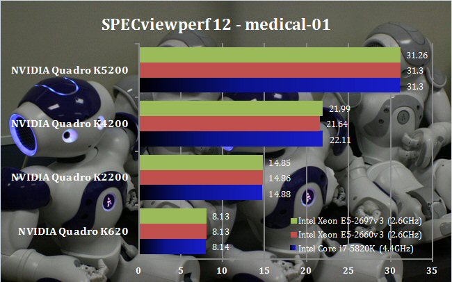 The medical viewsets show no benefit whatsoever from CPU speed. Real-time visualisation performance with these kinds of applications are entirely a factor of GPU capability. The benefits from each step up in graphics cost are fairly uniform, although the delta between the K620 and K2200 is most pronounced. So the choice of card depends in a somewhat linear fashion on how much performance you need and can afford. If you do need smoother performance, a more expensive card will provide this, and putting your money into this area is the best choice.