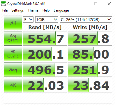 The PNY SSD lives up to its billing for read performance, and exhibits the reduced write performance we usually see with CrystalDiskMark.