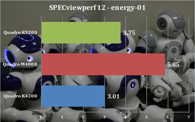 There is clearly something very beneficial for energy-01 from the Maxwell architecture. The M4000 is phenomenal in this test, and the M6000 was even more phenomenal when we tested that in a Scan workstation. With a 56 per cent faster score than the K5200, the M4000 is really in its element here.