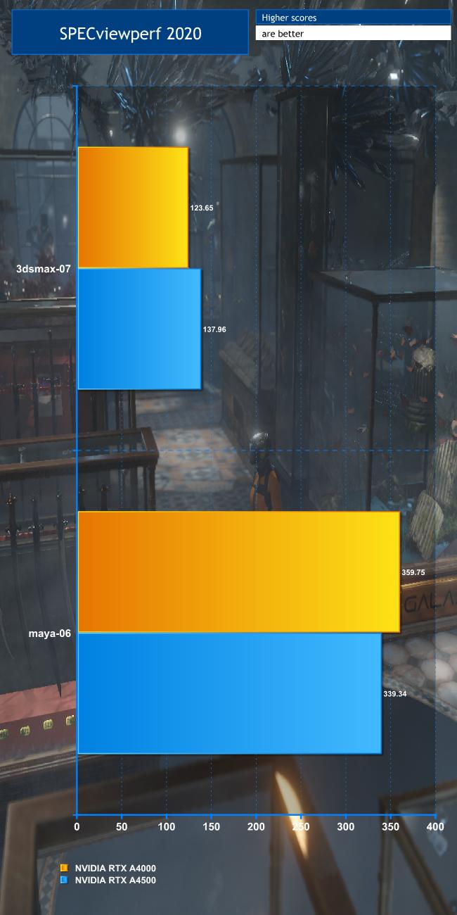 With Maya, the A4500 is at 68 per cent speed and the A4000 at 77 per cent. When we have performed this test before, the percentage for the A4000 was lower, implying that NVIDIA has improved its multitasking capabilities.