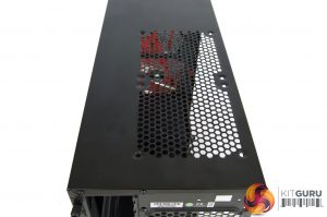 A quick look around the case is enough to refresh our memories. The I/O is at the top of the front-right edge of the case, leaving the front panel an untouched experiment in geometric design. If we peek over the top of the front panel, we see two fan bays available for added cooling.