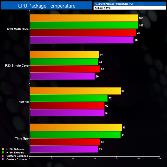 CPU Package temperature was measured within a number of the tests that I ran. The 12900K is a hot chip and so the R23 temperatures here reflect that in both single and multi-core and also between our AIO and custom loop. PCMark 10 did see some good improvements once we moved from the balanced profile on the AIO while in Time Spy, our custom loop really did help to knock those temperatures down considerably.