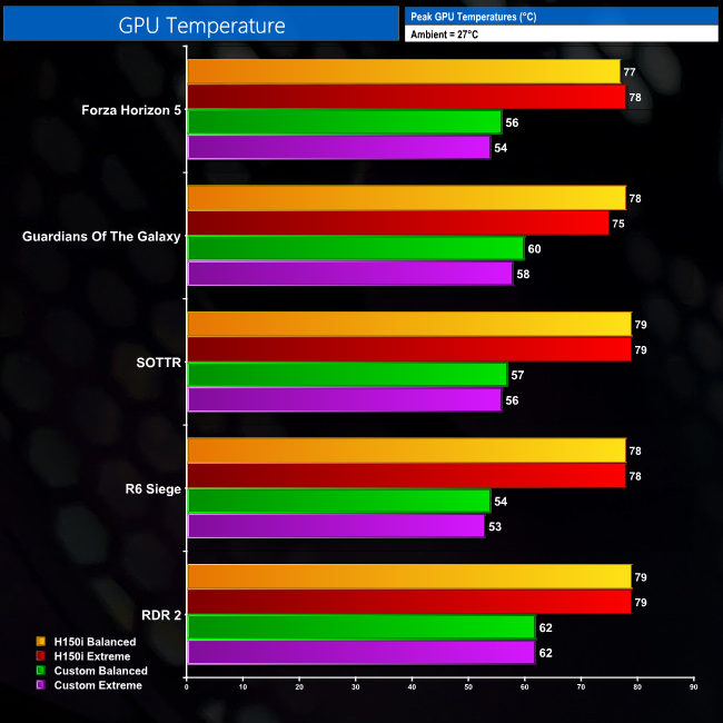 On GPU temperatures when running our benchmarks, across the board we have around a 30 percent reduction on average, so now we have some headroom to look at overclocking our GPU to help improve frame rates. This is really where water cooling does start to come into its own, and gives you the flexibility to overclock or set up custom fan profiles for a quieter system or increased performance.