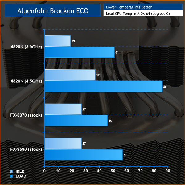 When you run the CPU at stock speed the Alpenfohn Brocken ECO does a fine job. The limitation with this cooler is that the fan tops out at 1,500rpm so once the cooler is overwhelmed with the heat it doesn't have any way to respond. It is an unfair criticism to say that the Brocken ECO cannot deal with an overclocked Core i7-4820K as that plays no part in its design.