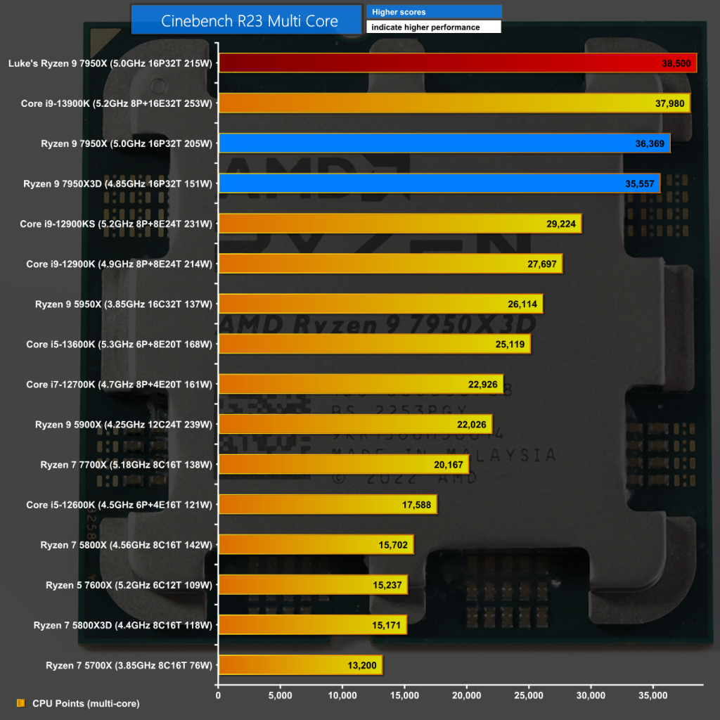 In Cinebench R23 Multicore we see Luke's original Ryzen 9 7950X topping the chart. Both versions of the CPU tested for this review follow behind with the 3D version running slightly slower.