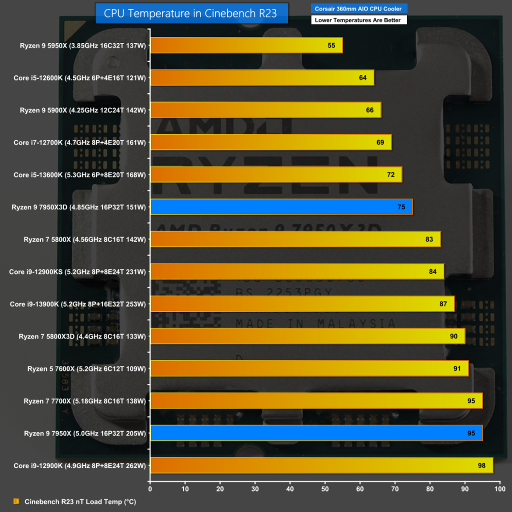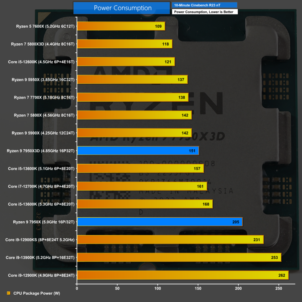It is truly remarkable to see how little power the 7950X3D uses under load, requiring a full 50W less than the regular 7950X. By contrast the Core i9-13900K is a power-hungry monster.
