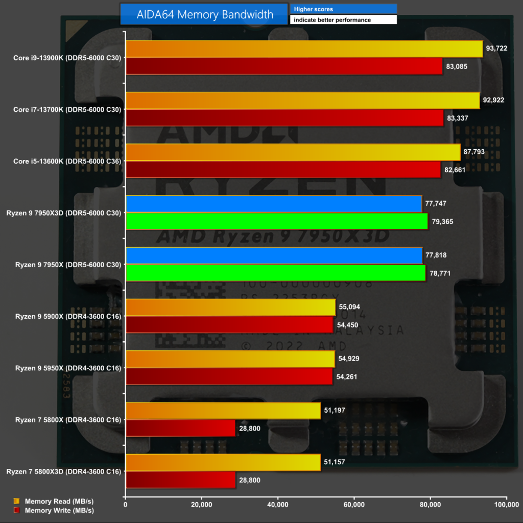 In AIDA64 we see the DDR5 configurations soundly beating DDR4, exactly as we would expect. Among the DDR5 contenders we can see Intel has a clear lead over AMD.