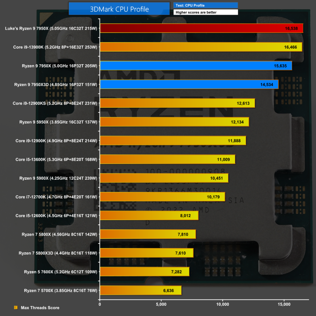 In the synthetic 3D Mark CPU Profile test we once again see Luke's Ryzen 9 doing superbly, followed by the Core i9-13900K. After that we have the second Ryzen 9 7950X and then we come to the new 3D model.
