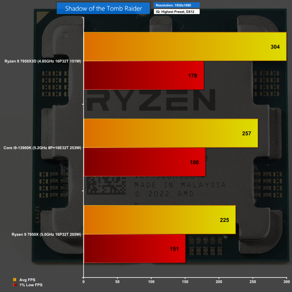 At 1080p we see a similar story in SotTR with the Ryzen 9 7950X soaring above the other CPUs.