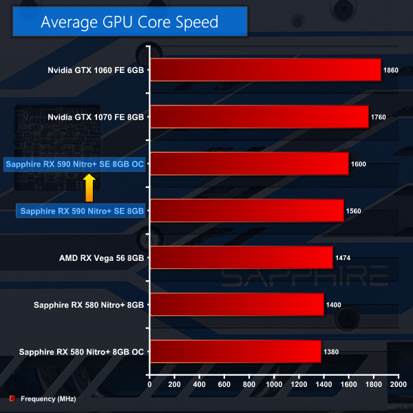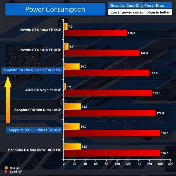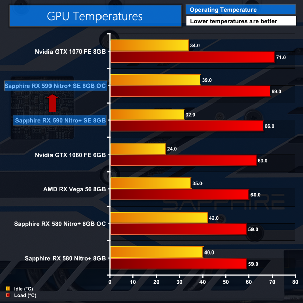 The idle temperatures for the two Nitro+ cards are unusual as Sapphire has a zero rpm function on its fans which means they only start turning when the core hits 50 degrees C. The loaded temperatures are interesting as the RX 590 is consistently hotter than RX 580. This is what we expected as the core is running faster, so it seems the die shrink has allowed higher clock speeds which in turn demand more power and produce extra heat.