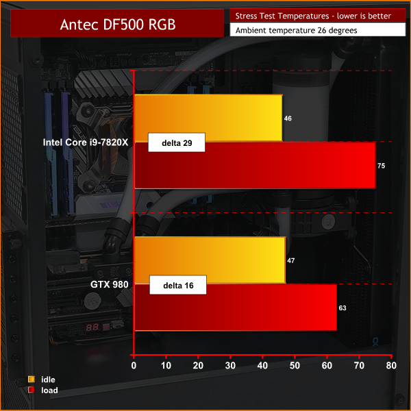 To put this case through its cooling paces we will be using a test system consisting of an Intel Core i7-7820X, reference GTX 980 and an SSD. This system allows us to produce a substantial amount of heat and effectively test the Antec DF-500 RGB’s cooling capabilities.