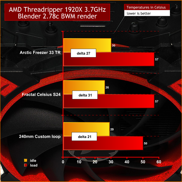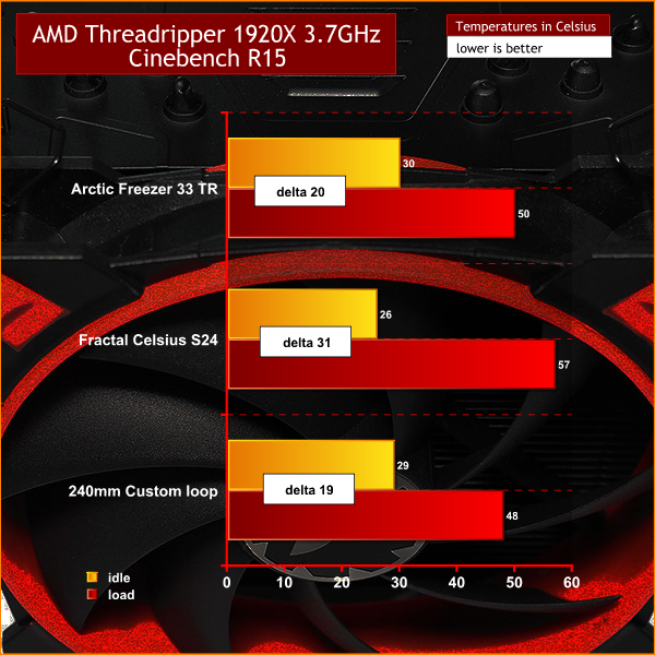 For the first test we ran Cinebench R15 a number of times until the temperature stabilised. At the stock clock speed of 3.7Ghz the Arctic and Fractal Design coolers were inseparable and the custom loop was marginally better. With the CPU overclocked to 4.0GHz the Arctic and Fractal Design coolers again performed identically while the custom loop slightly increased its advantage under load.