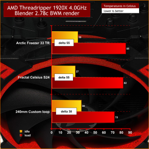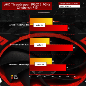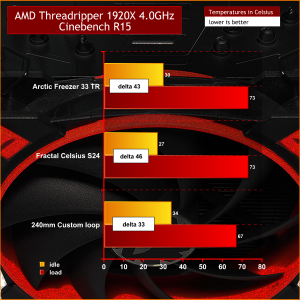 We ran the Threadripper 1920X at stock clock speeds with all cores running at 3.7GHz and then overclocked to 4.0GHz with a core voltage of 1.4V. We also used three different cooling systems on the Threadripper 1920X. The first is the Arctic Freezer 33 TR, the second is the Fractal Design Celsius S24, which is a 240mm Asetek All In One and the third system is a custom loop. The components in the loop are a 240mm Alphacool copper radiator, 2x 120mm Alphacool fans, an EK DDC pump/reservoir unit, an EK Supremacy EVO Threadripper block and Mayhems Pastel coolant.
