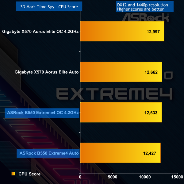3DMark Time Spy is indicative of high-end 1440p PC Gaming and we were surprised to see the ASRock couldn't quite keep up with our GigabyteX570 Aorus Elite. The difference is in the order of two percent and is fairly negligible but we expected the two systems would be locked in a dead heat.