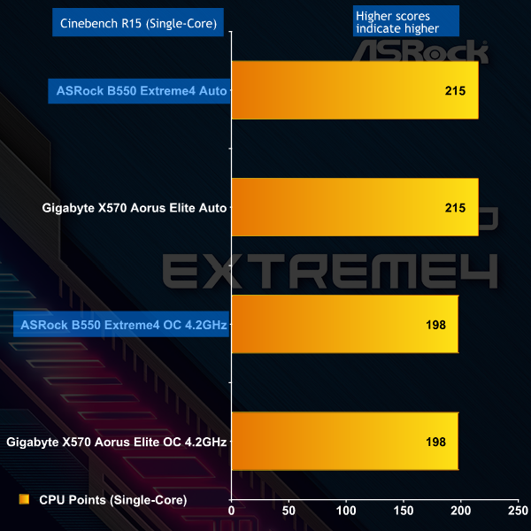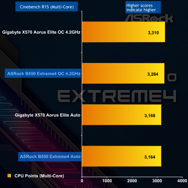 That's right Cinebench R15 rather than R20 as Maxon recently released Cinebench R23 and we haven't yet had the chance to accumulate test results. For the record, in Auto mode the ASRock scored 18,559 marks in Cinebench R23 Multi Core and 1,363 in Cinebench R23 Single Core but we have no idea whether that is good, bad or indifferent. Returning to Cinebench R15 with which we are familiar the ASRock B550 Extreme4 did a fine job and powered the Ryzen 9 3900X nicely.