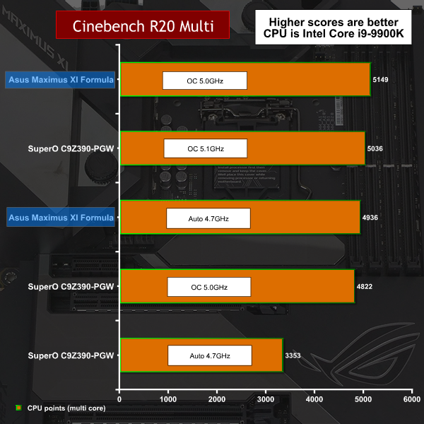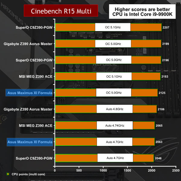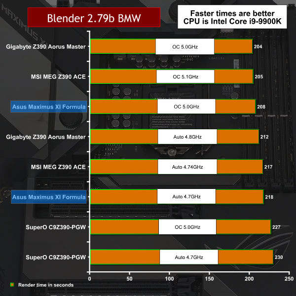 Blender is an intense test for the CPU and we see the Asus ROG Maximus XI Formula perform well.