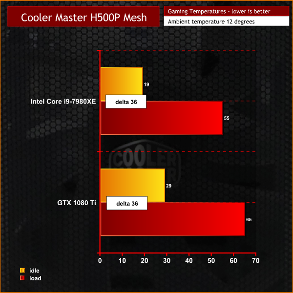 We tested the Cooler Master MasterCase H500P Mesh in a room with a bracing ambient temperature of 12 degrees and it performed well. Both our Core i9-7980XE and Sapphire RX Vega 64 were well within their safe limits and we had no complaints about air flow.