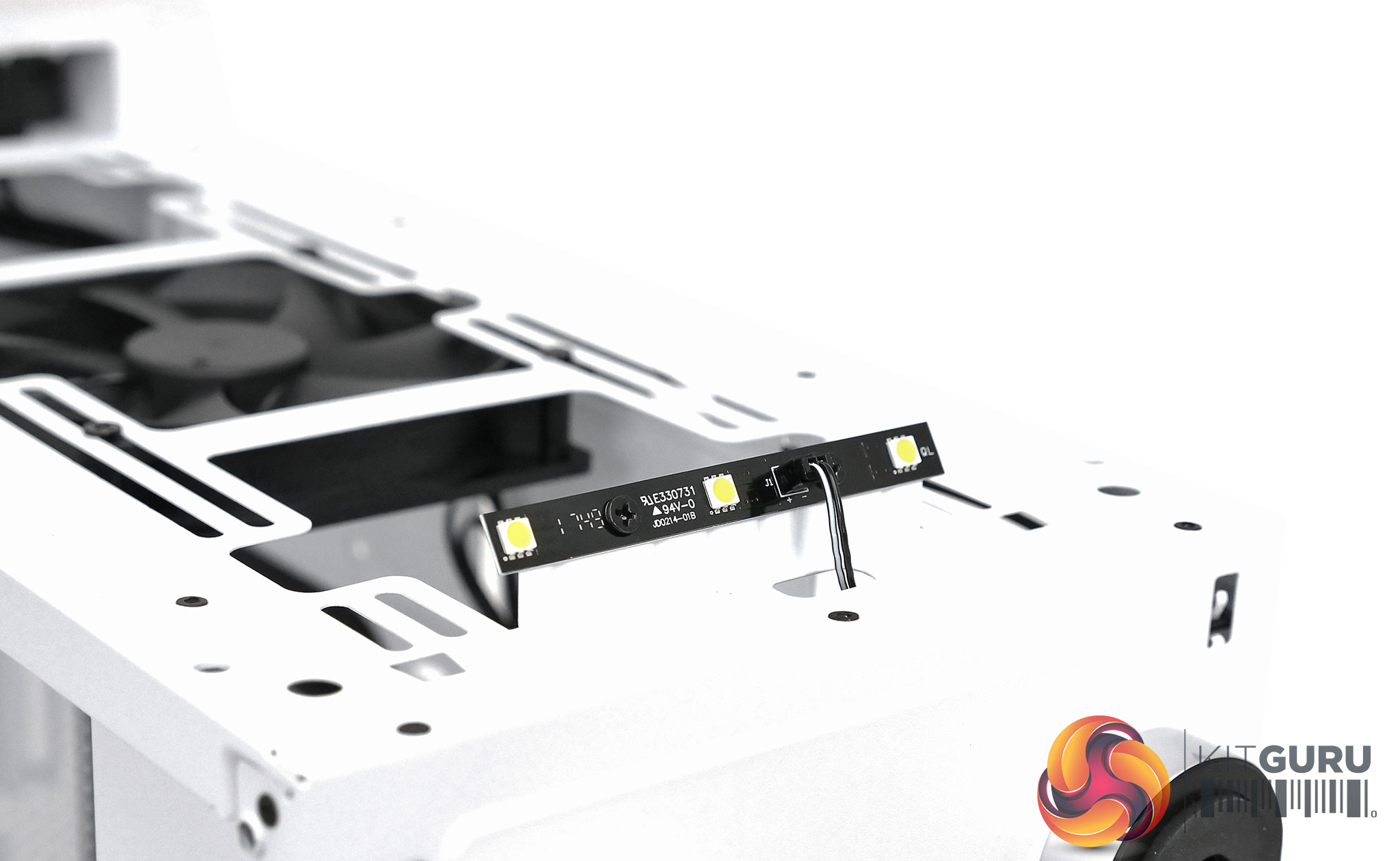 Once you pass that minor obstacle, remove the other side panel and pull off the front panel you quickly realise the core chassis looks amazingly familiar. It has a fixed power supply cover with a small drive cage positioned in front of the power supply and two SSD caddies on the rear of the motherboard tray. The I/O panel is on the top of the case and provides two USB 3.0 ports along with headset jacks and Power/Reset buttons. There are two basic Corsair SP120 fans installed in the case and underneath the front panel a short strip of white LEDs provides a gentle under-glow. It is a simple fixed light that cannot be controlled or varied, which will either please you with its simplicity or annoy you with its lack of functionality.