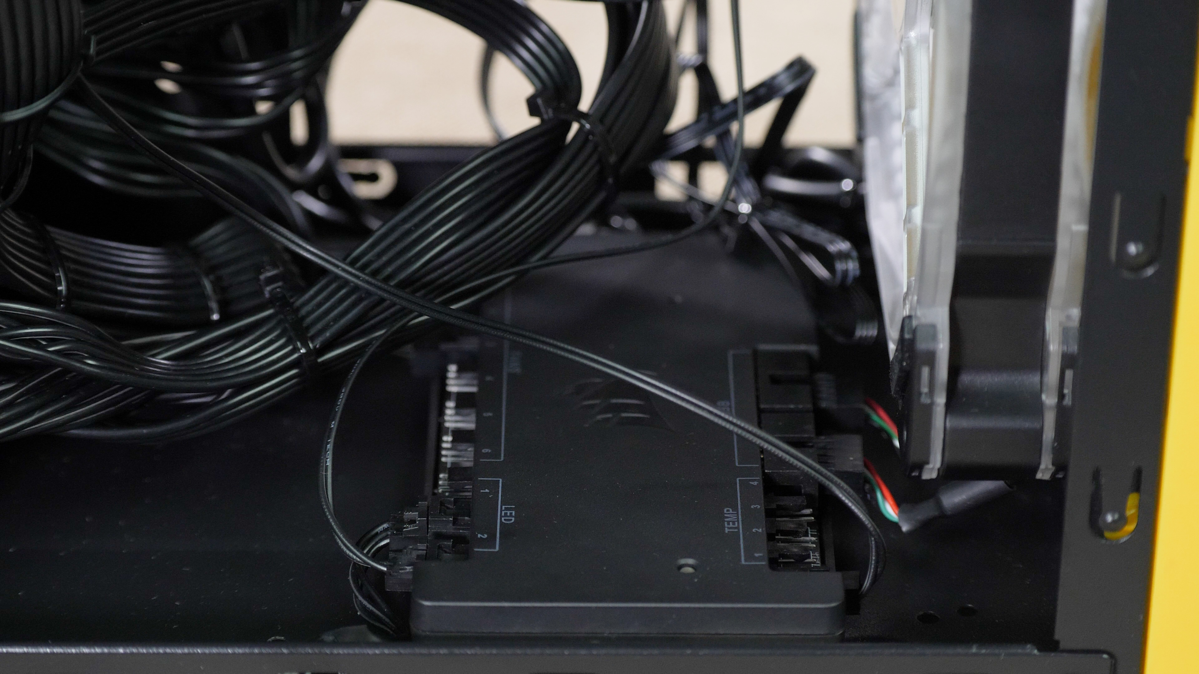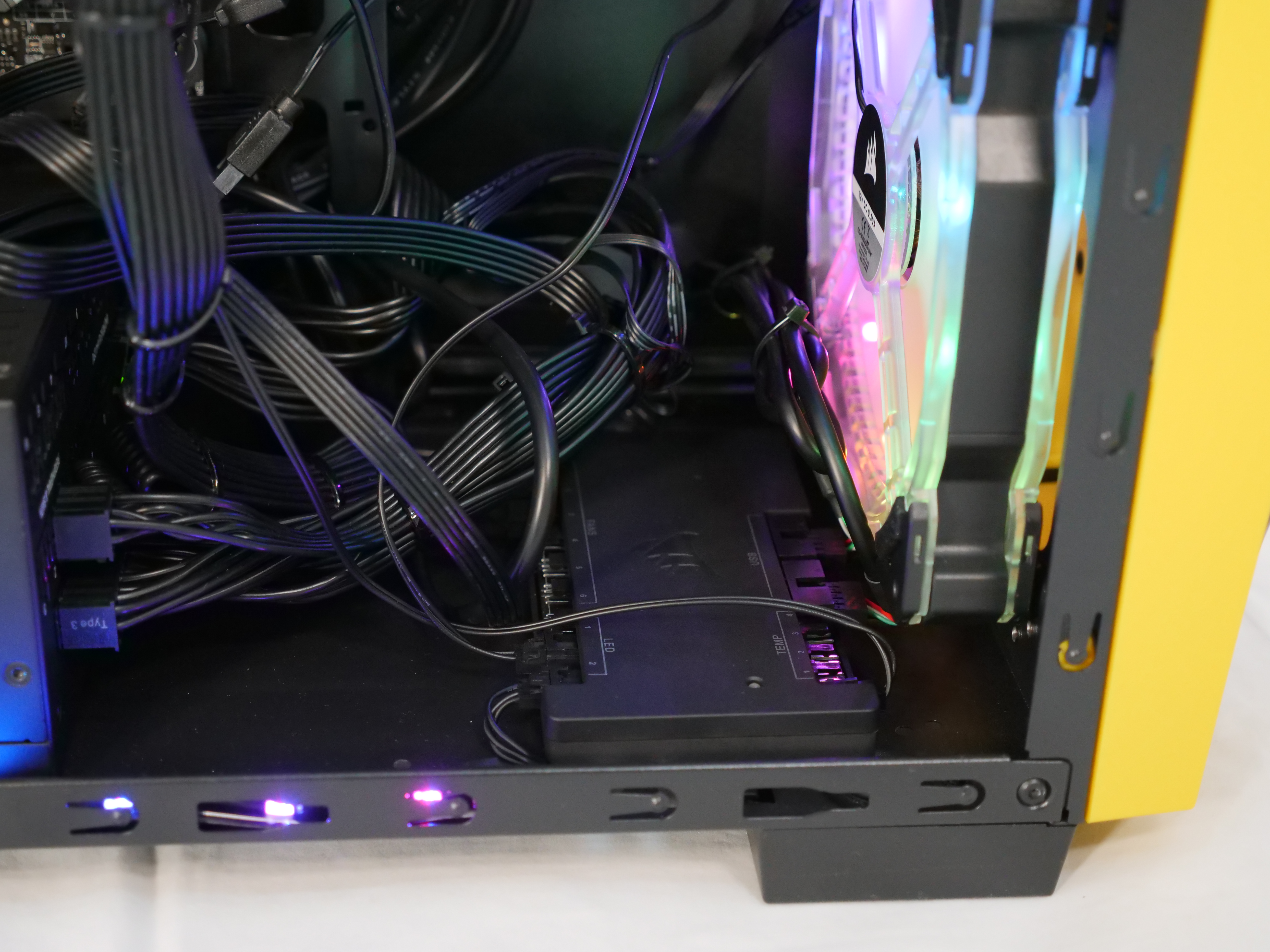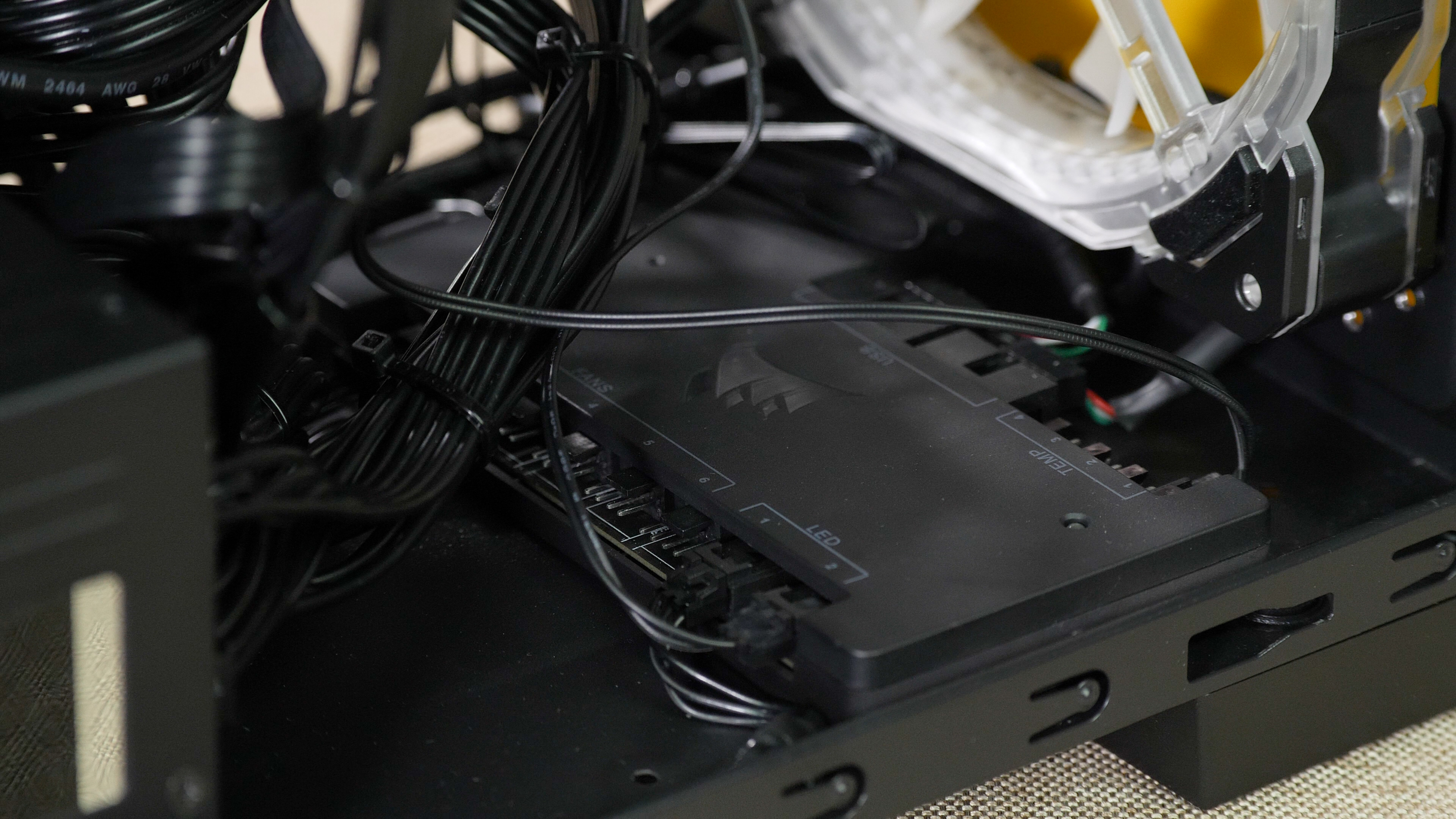 So we deliberately went in the opposite direction and installed as much Corsair hardware as possible inside a budget SPEC-04 case. This worked surprisingly well, apart from the fact the SPEC-04 has the bare minimum of cable management. So, basically, sorry about the cable mess in front of the power supply. That’s our bad.