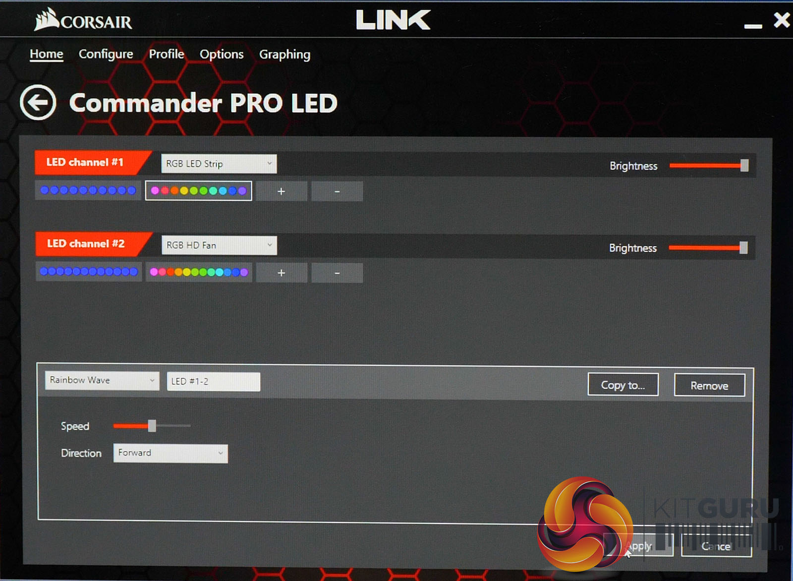 You can connect up to six fans directly to the Commander Pro to control the fan speed profile. You still need to use the lighting control unit to manage the LEDs in those six fans, although the controller can be connected to one of the LED ports on the Commander Pro or to one of the ports on the Node. You can also daisy chain the Node to the Corsair Commander Pro and can connect two channels of LED lights with up to four strips of lights on each channel. If there is a case on the market that can accommodate four lighting strips let’s just say it must be a very large case.