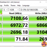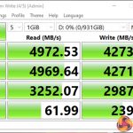 Events took a turn for the interesting when we switched CrystalDiskMark 8 to Peak Performance mode and ran the test in four loops. As you will see in our video this drove temperatures up and when the MP600 Pro hit 70 degrees we could see the write speeds throttling to 5.3GB/sec and then to 4.6GB/sec. By contrast the Hydro X drive maintained a temperature in the low-50s Celsius and delivered performance that was consistent.
