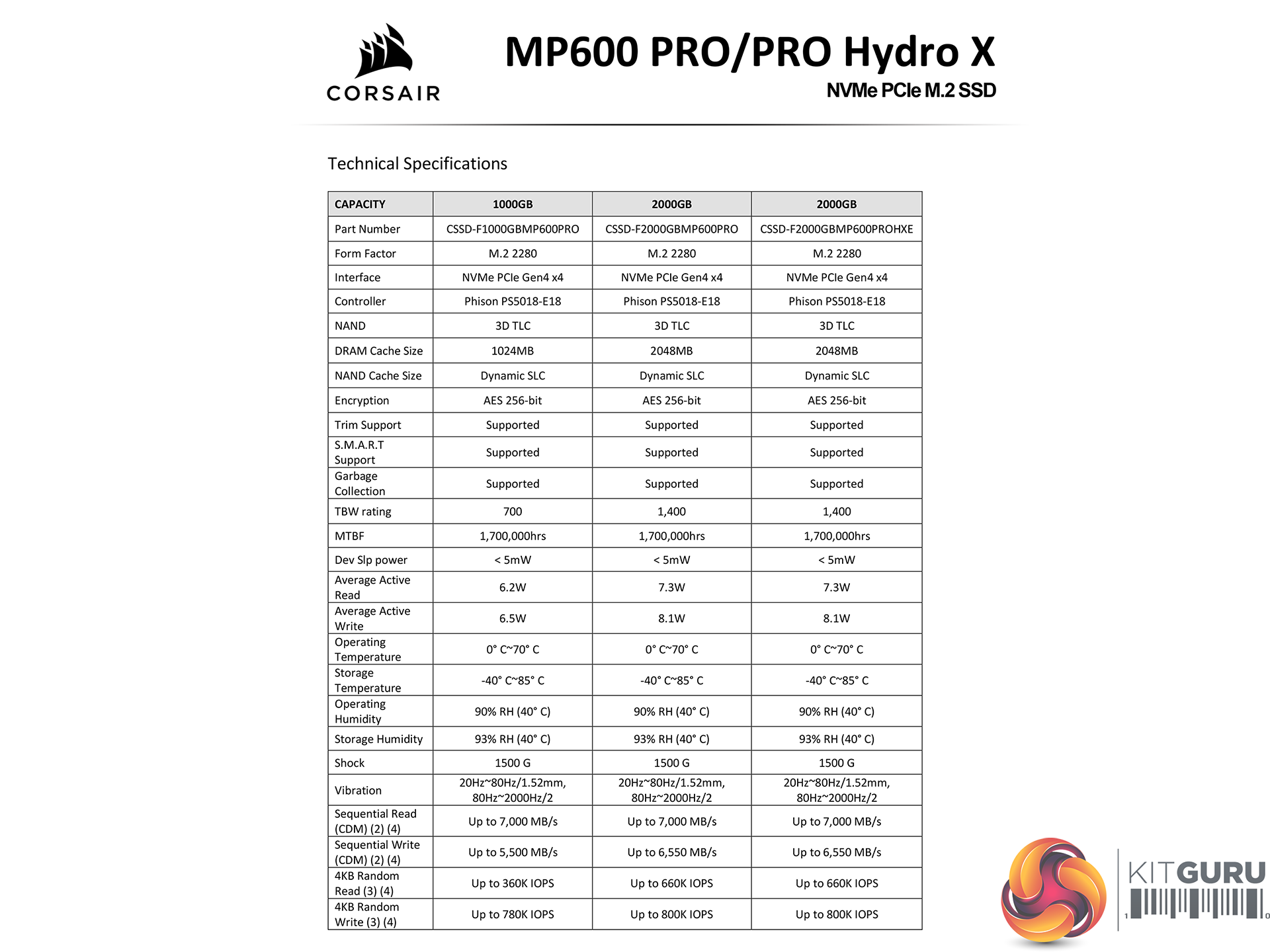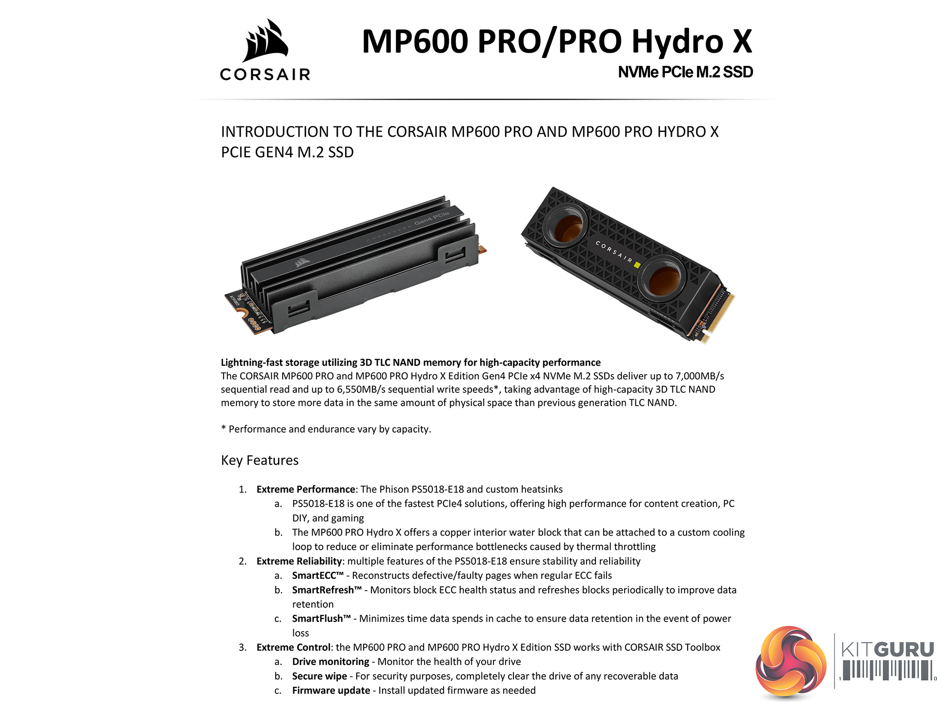 There are three models in the range of Corsair MP600 Pro SSDs. 1TB, 2TB and 2TB Hydro X, and clearly the focus is on the change from the Phison E16 controller used in Force MP600 to the new E18 controller.