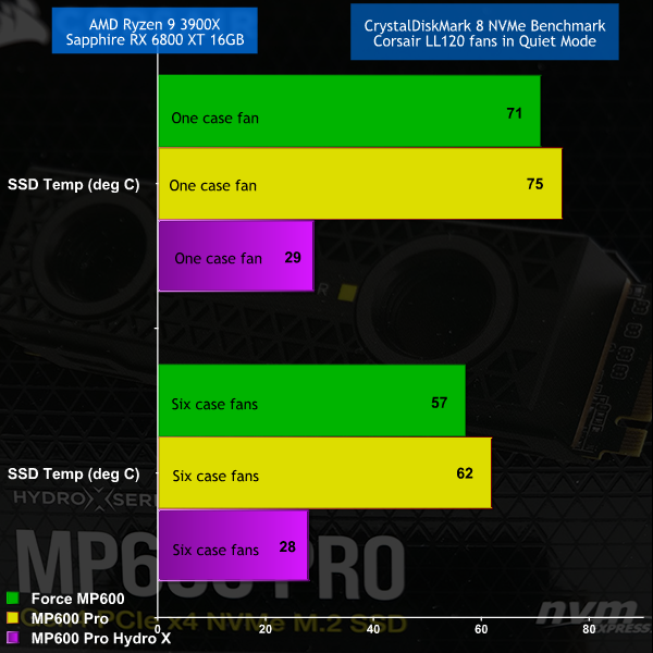 Our graphs show the temperature results we demonstrated in our video when we were running CrystalDiskMark 8 in NVMe mode. Performance was in line with the screen grabs further up the page. Our main takeaway was the temperature of the Hydro X SSD was more than 40 degrees Celsius lower than the regular MP600 Pro drive, however performance was unchanged.
