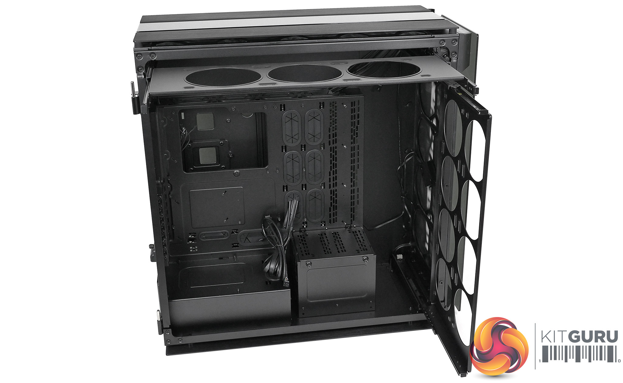 If you are using a double chamber case the rear compartment might provide a good location for a radiator, however the 1000D simply doesn’t have the space in that dimension. Added to that you will have a great deal of cabling to hide away and it is bound to end up behind the right hand cover and those folding French doors.