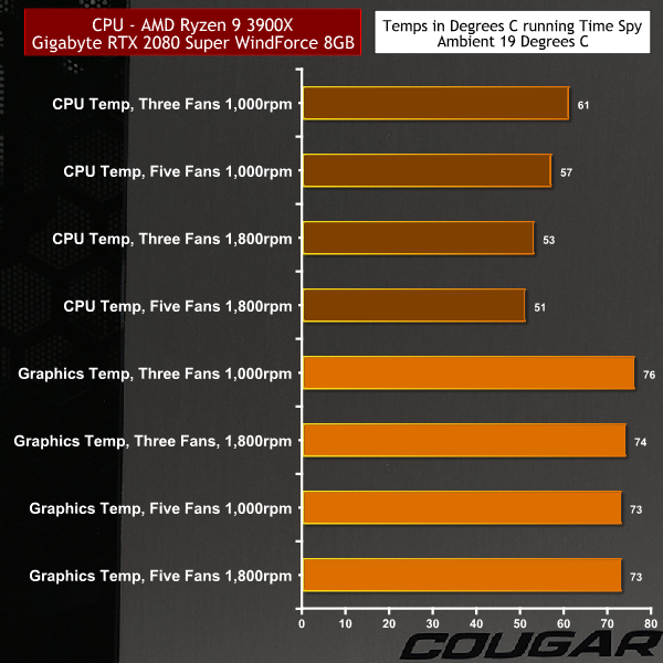 You can learn pretty much everything you want to know about the performance of the DarkBlader-G by studying these two charts. The graphics card temperature is barely affected by the speed of the case fans, or whether you have three or five fans installed. When it comes to CPU temperature we saw a significant reduction in temperature when we cranked up the air flow but the major determinant was the workload. The peak CPU temperature in Time Spy was very low while in AIDA64 we saw the CPU running 30 degrees C hotter. Please, do not buy the DarkBlader-G if you intend to run professional work loads.