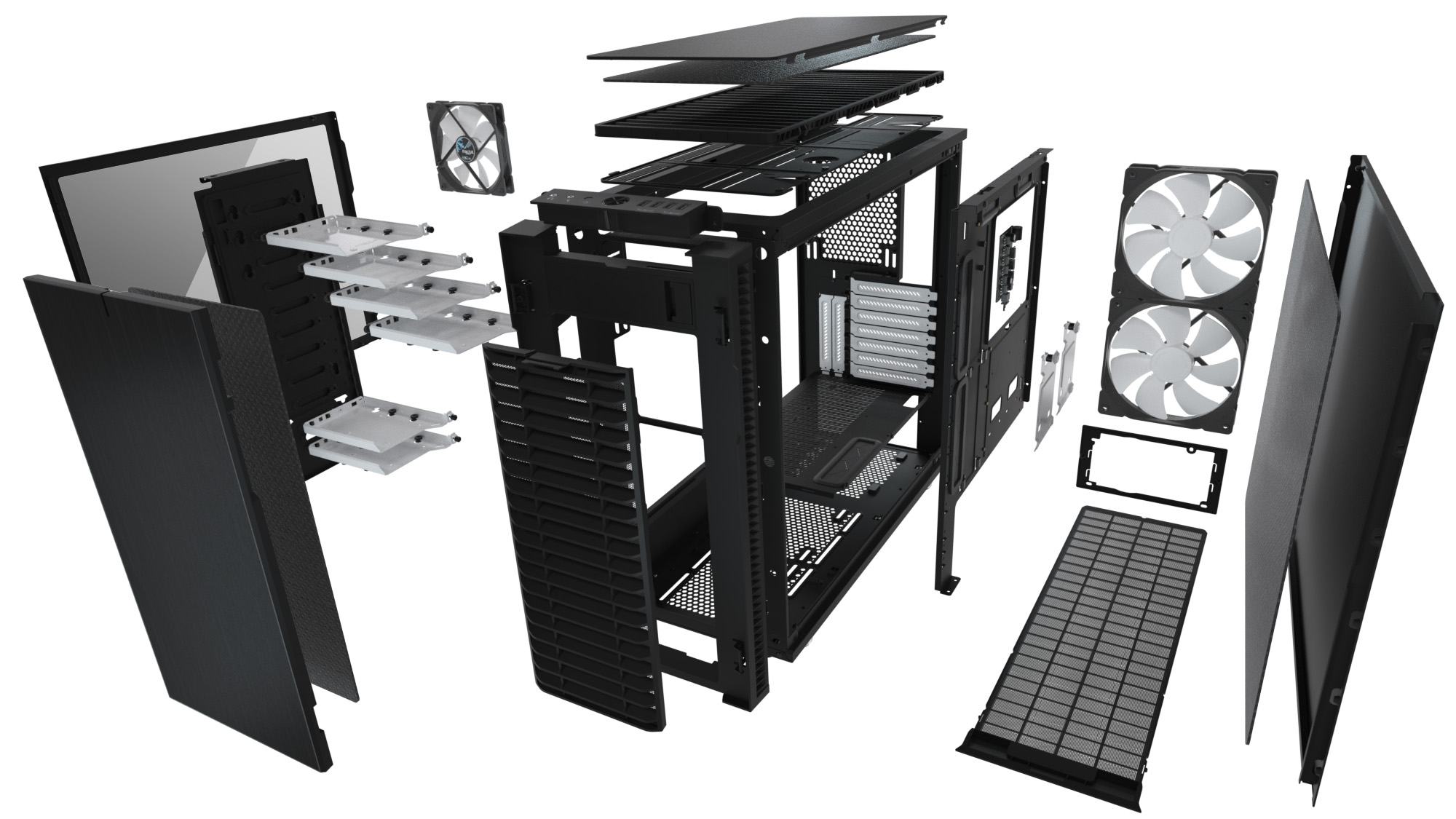 Fan mounts: 3x 120mm/2x 140mm front, 3x 120mm/2x 140mm standard roof layout, 3x 120mm/140mm roof in Open layout, 1x 120mm/140mm rear, 2x 120mm/140mm floor.