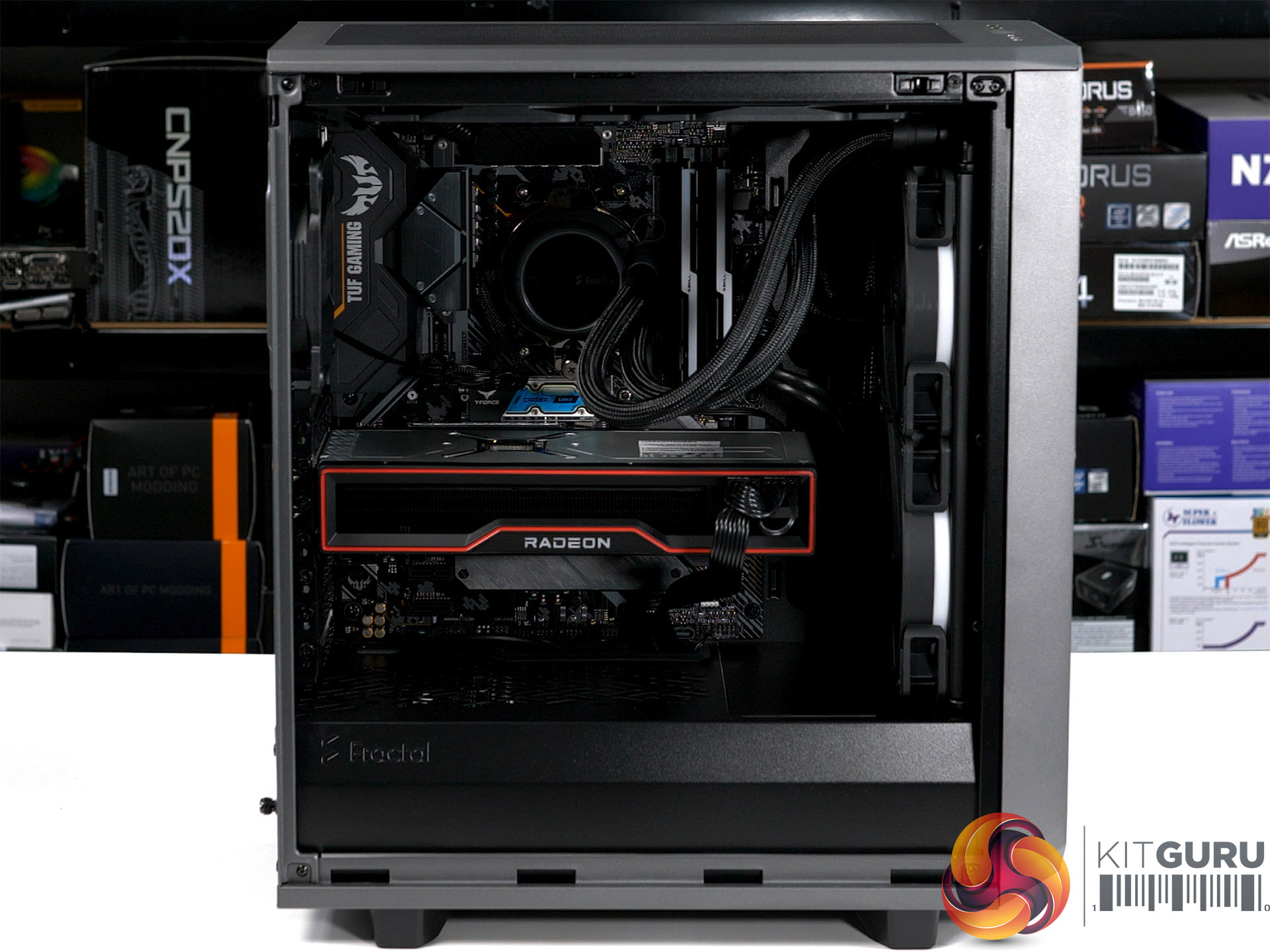 As you will see in our video, we had no difficulty moving the supplied 140mm Fractal Dynamic X2 GP-14 fans from the front of the case to the roof and then installing a 280mm Fractal Design Celsius+ AIO cooler in their place. We had plenty of space to install a massive Sapphire RX 6800 XT graphics card and had to look hard to establish what makes this a compact case, rather than a regular ATX mid-tower. The answer lies in the details, such as the absence of a vertical GPU option or the inability to install a 140mm/280mm radiator in the roof.
