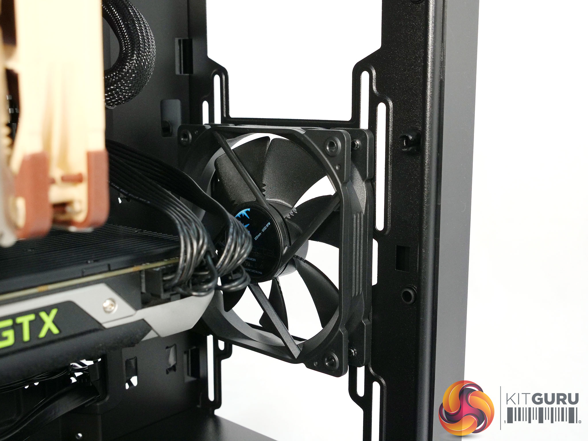 We mentioned that Fractal Design made some changes from the Define C to create the Meshify C, and these essentially boil down to a move from white to black. The two 1,200rpm Dynamic X2 GP-12 fans are black, the PCI expansion slot blanking brackets are black and the metal HDD trays are black.