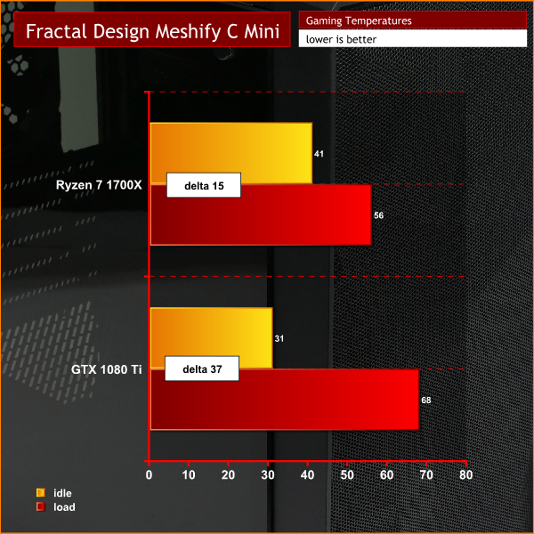 The good news here is that the smaller size of the Meshify C Mini has no obvious impact on performance, and both our Ryzen 7 1700X CPU and GTX 1080 Ti GPU remained cool under full load.